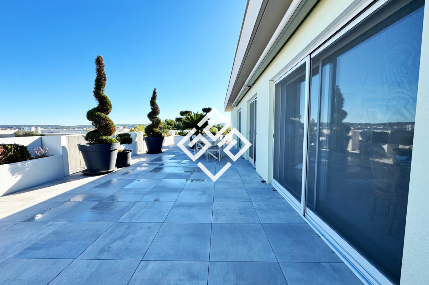 Au dernier étage d'une résidence récente et sécurisée, cet appartement contemporain conjugue élégance, confort et espace extérieur d'exception. Ici, chaque détail a été pensé pour profiter d'une vie intérieure-extérieure harmonieuse. D'une surface habitable de 88,7 m2, ce bien s'ouvre sur une vaste pièce de vie baignée de lumière, prolongée par de grandes baies vitrées menant à une terrasse spectaculaire de 114 m2, aménagée.La cuisine moderne, entièrement équipée, s'intègre avec fluidité à l'espace de réception.L'espace nuit se compose de deux chambres lumineuses avec accès extérieur, et d'une salle d'eau contemporaine.De nombreux rangements optimisent le confort au quotidien, tandis qu'un double garage fermé en sous-sol complète cet ensemble rare.Situé au 3? et dernier étage, l'appartement offre une atmosphère paisible, ouverte sur le ciel et la ville. Atouts