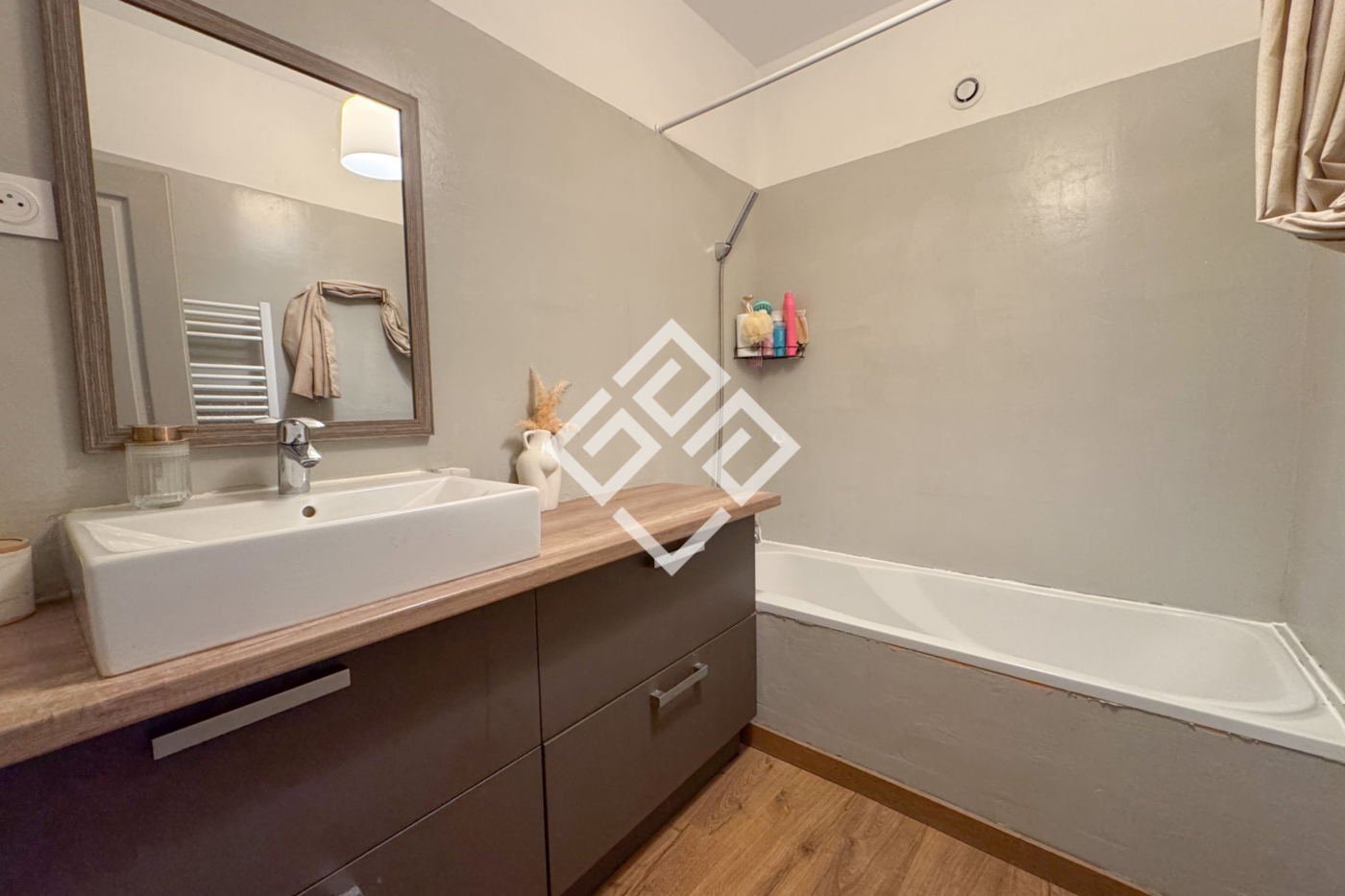Une salle de bain avec baignoire et meuble vasque, ainsi qu'un WC indépendant, complètent l'agencement.