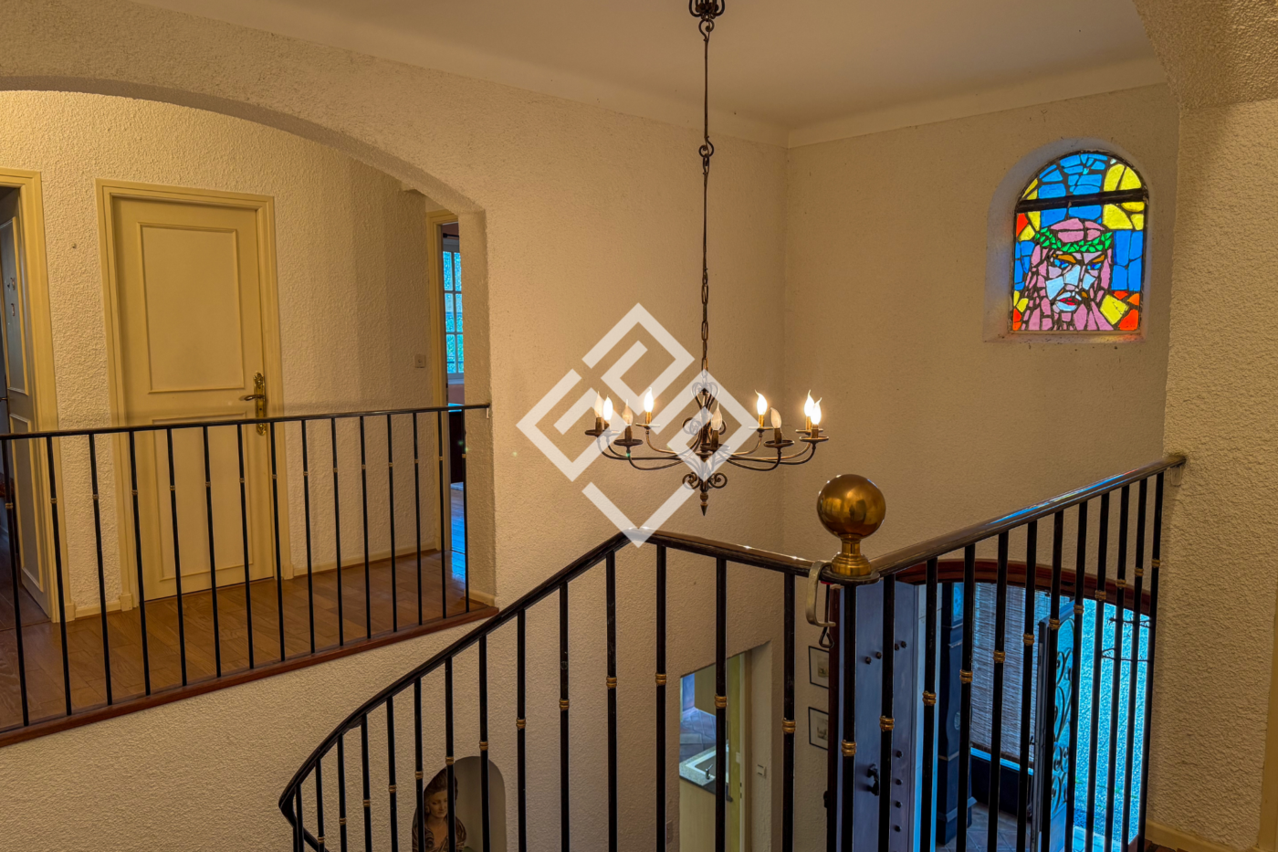 Un magnifique escalier mène au premier étage et constitue à lui seul un véritable élément de charme de la maison. En le gravissant, on découvre sur le mur un très joli vitrail qui diffuse une lumière douce et colorée, renforçant le caractère unique et l'authenticité des lieux.