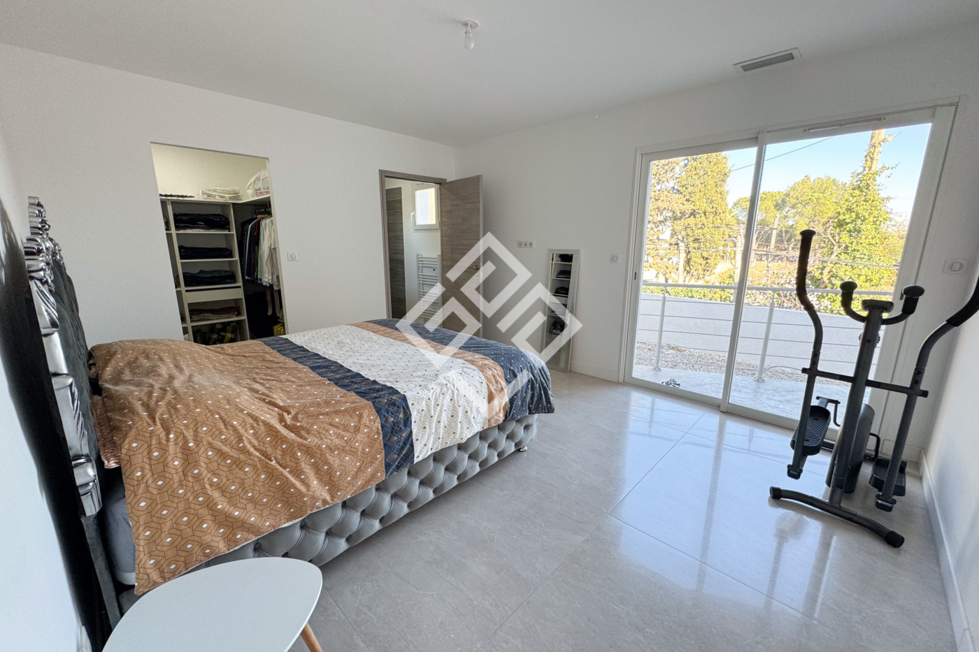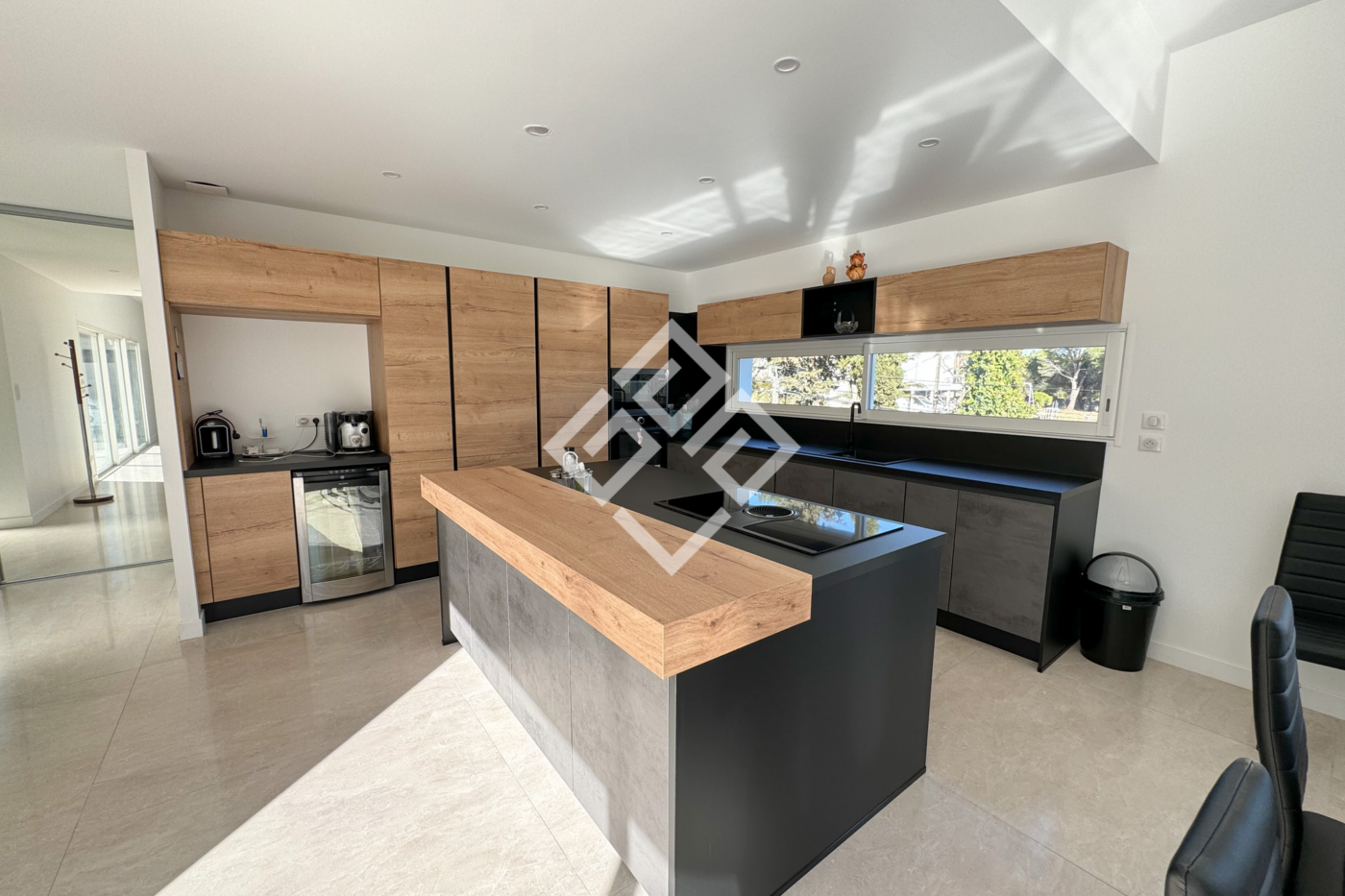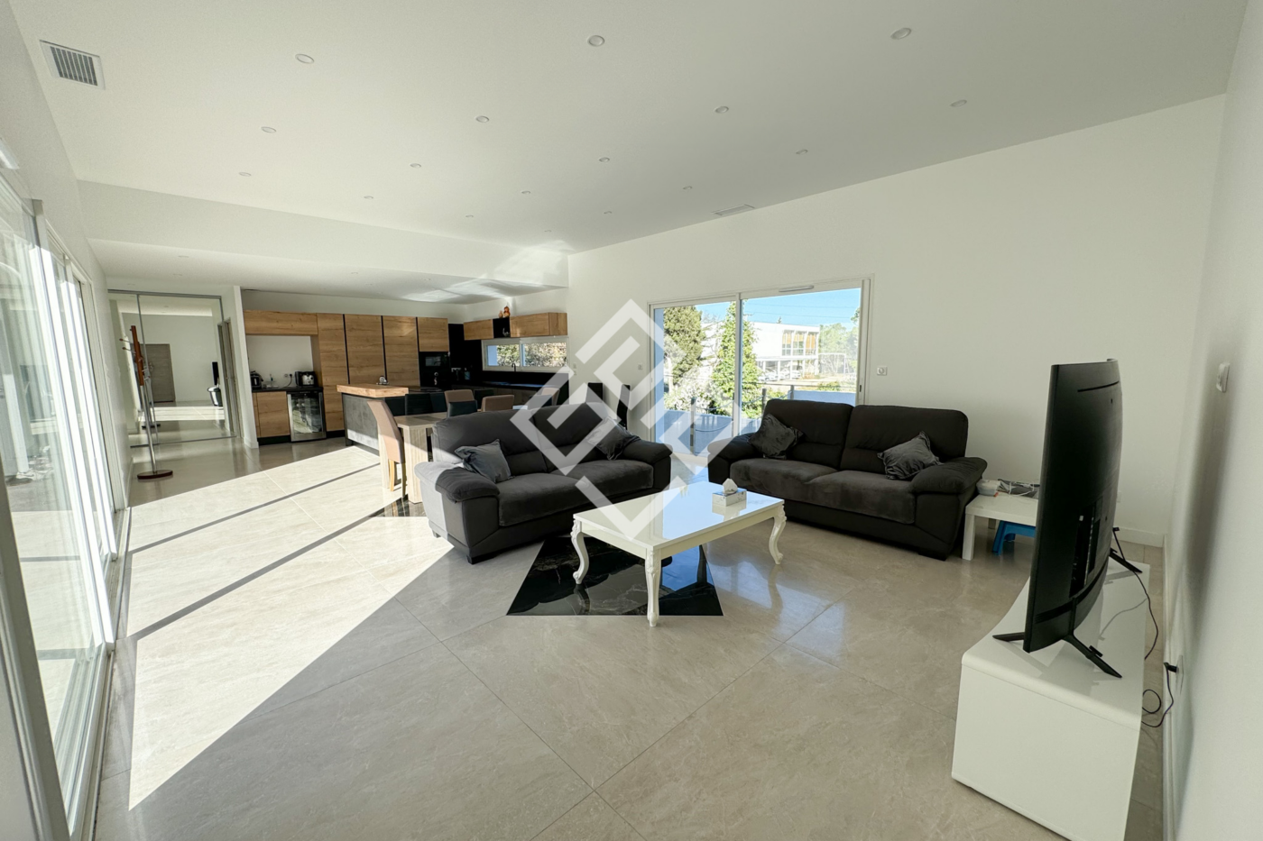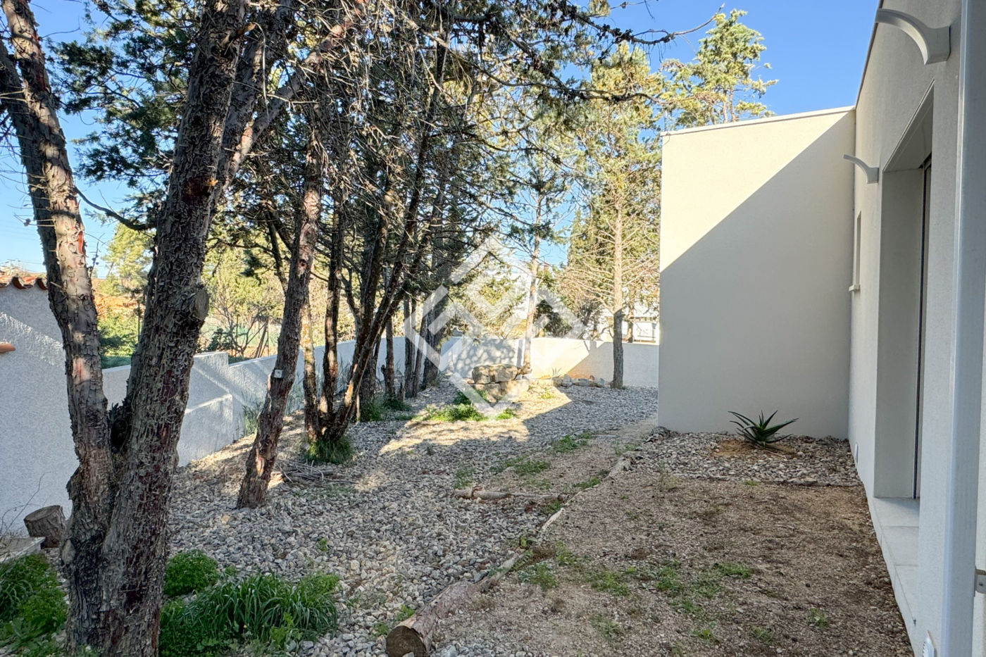 GALA IMMOBILIER a le plaisir de vous présenter, dans un cadre paisible et préservé, à Narbonne, cette magnifique villa contemporaine de plain-pied d'une surface de 150 m2, nichée sur une parcelle spacieuse (747 m2). Érigée récemment en 2023, elle se distingue par son niveau de qualité et ses finitions raffinées, générant une atmosphère chaleureuse et confortable dans chaque pièce. Les larges baies vitrées, qui inondent l'intérieur de lumière naturelle, permettent une transition fluide entre l'intérieur et l'extérieur afin de profiter pleinement du jardin. La villa est composée de divers éléments importants : L'entrée (9 m2) avec placard de rangement dessert toutes les pièces. Une magnifique pièce de vie de (57 m2) comprenant un salon, une salle à manger et une cuisine sur mesure parfaitement intégrée dans l'esprit de la décoration. Ses larges ouvertures sur le jardin apportent une agréable clarté et une réussite de l'intérieur et de l'extérieur. Côté nuit, il y a deux toilettes indépendantes (2,54 m2)-(3 m2), une chambre (12,80 m2) avec placard et son petit balcon privé donnant sur le jardin, une salle de bain (7 m2) avec baignoire et double vasque. Une suite parentale avec vue sur la piscine (25,54 m2) aménagée d'un dressing et d'une salle d'eau privative comprenant une douche, une vasque et des toilettes. Une deuxième suite parentale (24 m2) également pourvue d'un dressing et d'une salle d'eau comprenant une douche et une vasque avec une terrasse privative. Enfin, une buanderie (6 m2) vient compléter cet ensemble immobilier. Un garage motorisé isolé et carrelé de (23,50 m2) . L'extérieur : Une terrasse en bois de 20 m2 offrira un cadre propice aux rencontres amicales et conviviales. Une terrasse en béton ciré, située côté piscine, offrira une vue imprenable sur le jardin contemporain et intime, ajoutant une touche de raffinement à vos journées estivales. Ces lieux sont idéaux pour des repas en plein air, dans un environnement préservé de tout regard indiscret. Ses atouts: Une maison récemment construite, de plain-pied, dotée de deux suites parentales et d'une chambre indépendante, offrant une luminosité exceptionnelle. De plus, elle dispose d'une piscine ainsi que d'un système de chauffage gainable et d'un chauffe-eau thermodynamique.