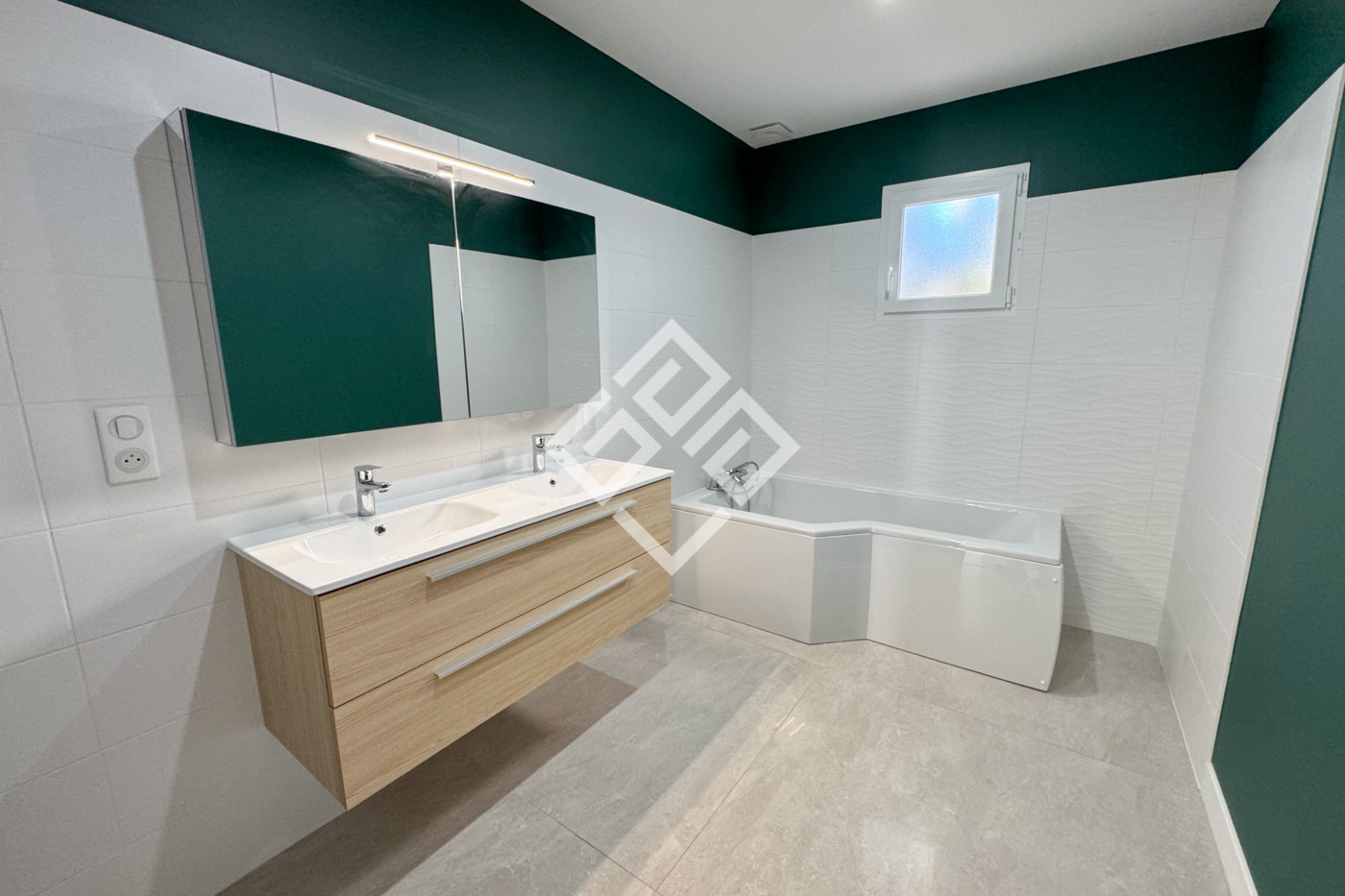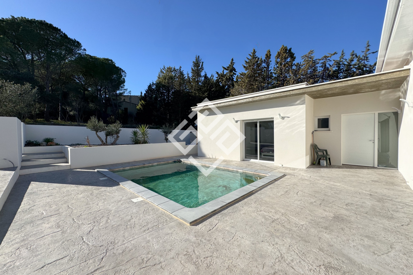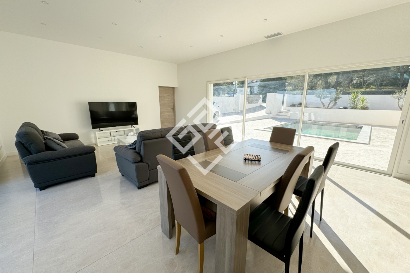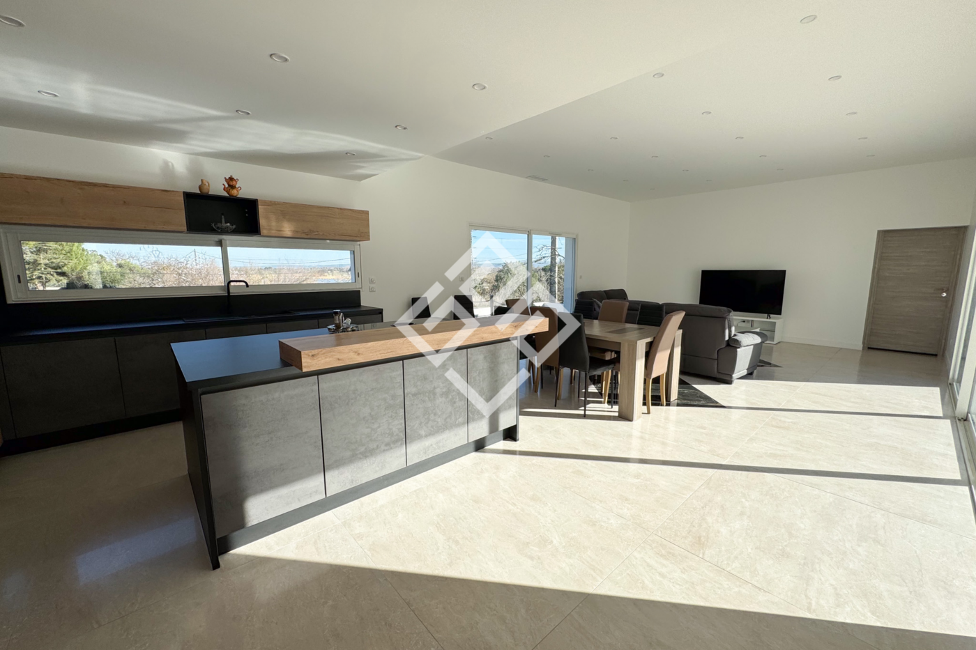 GALA IMMOBILIER a le plaisir de vous présenter, dans un cadre paisible et préservé, à Narbonne, cette magnifique villa contemporaine de plain-pied d'une surface de 150 m2, nichée sur une parcelle spacieuse (747 m2). Érigée récemment en 2023, elle se distingue par son niveau de qualité et ses finitions raffinées, générant une atmosphère chaleureuse et confortable dans chaque pièce. Les larges baies vitrées, qui inondent l'intérieur de lumière naturelle, permettent une transition fluide entre l'intérieur et l'extérieur afin de profiter pleinement du jardin. La villa est composée de divers éléments importants : L'entrée (9 m2) avec placard de rangement dessert toutes les pièces. Une magnifique pièce de vie de (57 m2) comprenant un salon, une salle à manger et une cuisine sur mesure parfaitement intégrée dans l'esprit de la décoration. Ses larges ouvertures sur le jardin apportent une agréable clarté et une réussite de l'intérieur et de l'extérieur. Côté nuit, il y a deux toilettes indépendantes (2,54 m2)-(3 m2), une chambre (12,80 m2) avec placard et son petit balcon privé donnant sur le jardin, une salle de bain (7 m2) avec baignoire et double vasque. Une suite parentale avec vue sur la piscine (25,54 m2) aménagée d'un dressing et d'une salle d'eau privative comprenant une douche, une vasque et des toilettes. Une deuxième suite parentale (24 m2) également pourvue d'un dressing et d'une salle d'eau comprenant une douche et une vasque avec une terrasse privative. Enfin, une buanderie (6 m2) vient compléter cet ensemble immobilier. Un garage motorisé isolé et carrelé de (23,50 m2) . L'extérieur : Une terrasse en bois de 20 m2 offrira un cadre propice aux rencontres amicales et conviviales. Une terrasse en béton ciré, située côté piscine, offrira une vue imprenable sur le jardin contemporain et intime, ajoutant une touche de raffinement à vos journées estivales. Ces lieux sont idéaux pour des repas en plein air, dans un environnement préservé de tout regard indiscret. Ses atouts: Une maison récemment construite, de plain-pied, dotée de deux suites parentales et d'une chambre indépendante, offrant une luminosité exceptionnelle. De plus, elle dispose d'une piscine ainsi que d'un système de chauffage gainable et d'un chauffe-eau thermodynamique.