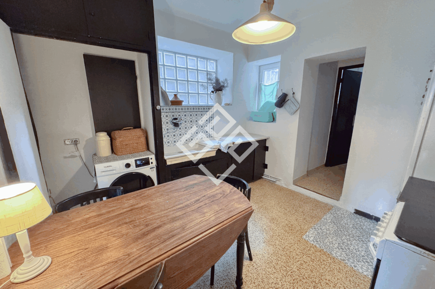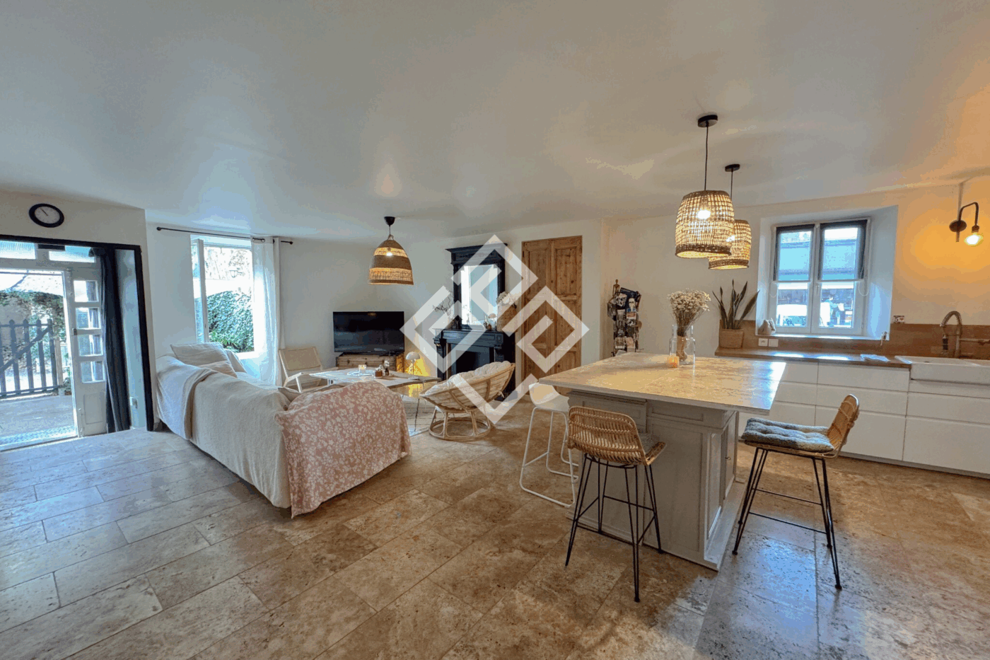 La pièce de vie impressionne par ses espaces ouverts où se côtoient un salon accueillant, une salle à manger conviviale et une cuisine entièrement équipée. À cela s'ajoutent une arrière-cuisine, une salle d'eau, et des toilettes séparés. L'ensemble a été pensé pour offrir un cadre de vie à la fois pratique et agréable.