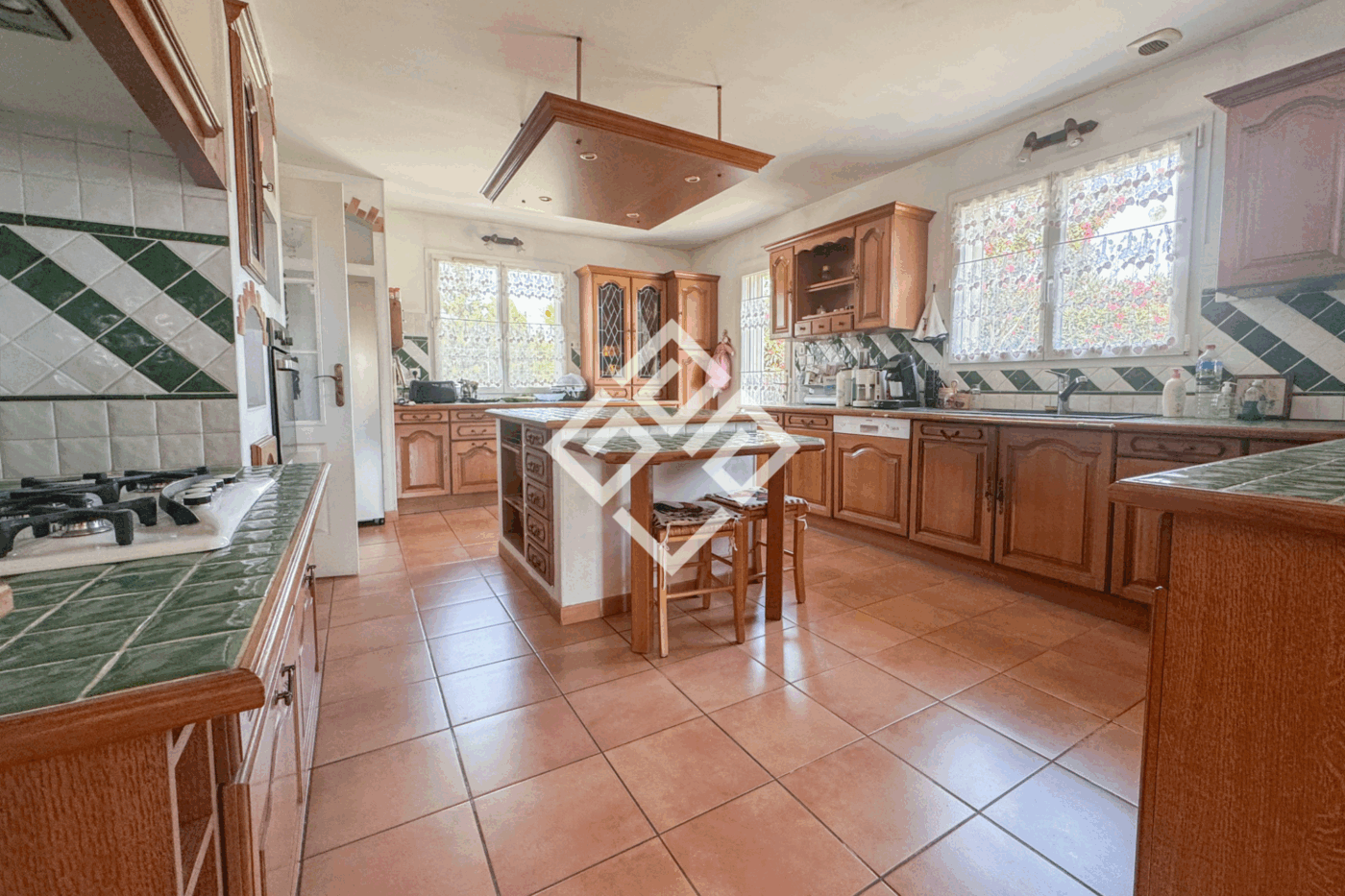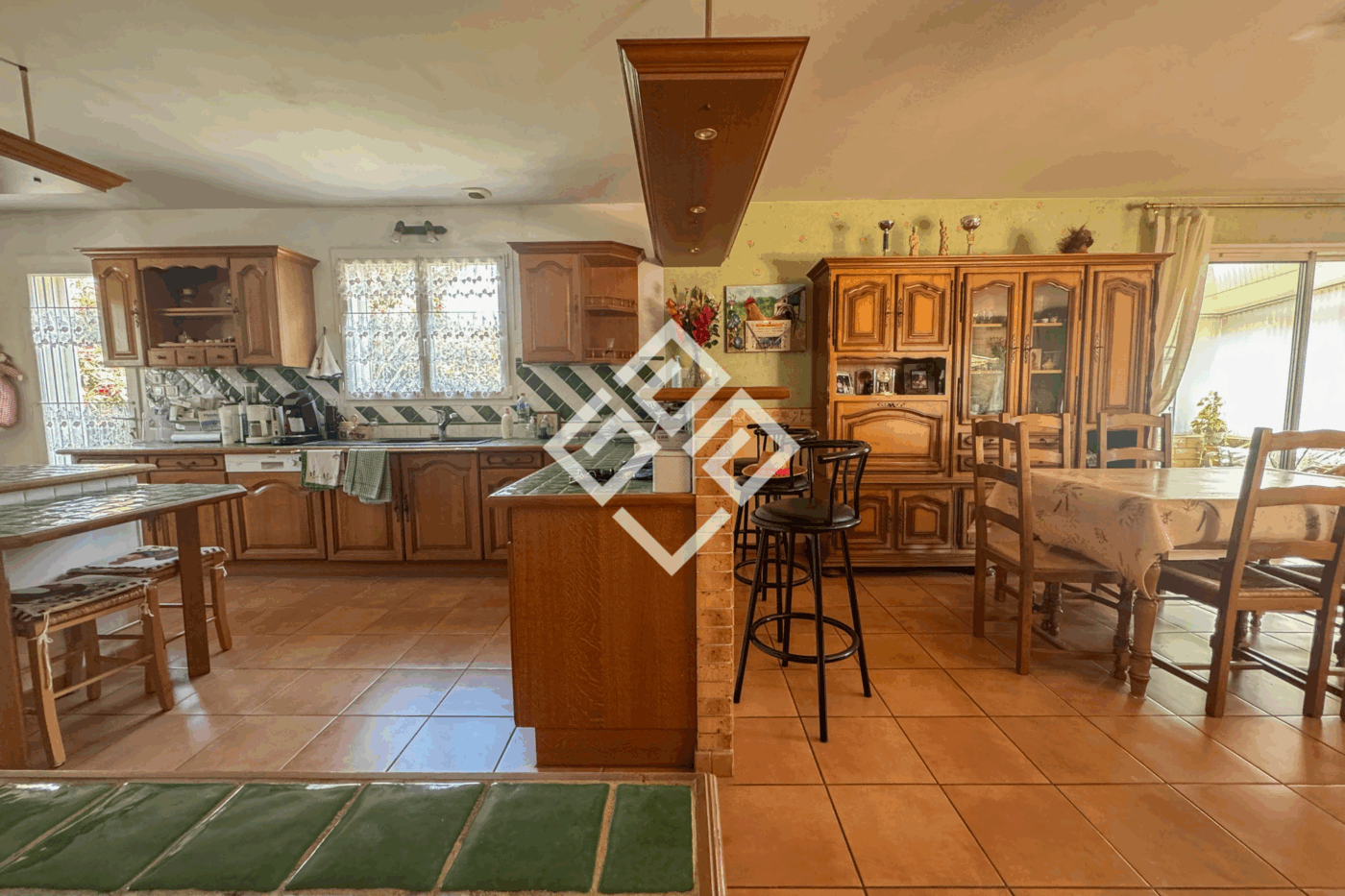 Dès l'entrée, la lumière et l'espace séduisent immédiatement. Le vaste séjour de 40 m2, tourné plein sud et réchauffé par un poêle à bois, communique avec une grande cuisine de 24 m2, idéale pour recevoir famille et amis en toute convivialité.