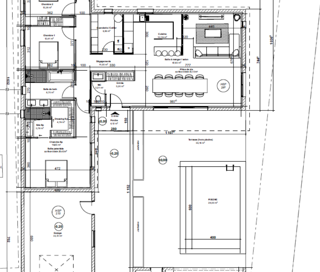 Grâce à une large baie vitrée de 4 mètres, la pièce s'ouvre pleinement sur l'extérieur, créant une continuité harmonieuse entre intérieur et extérieur.