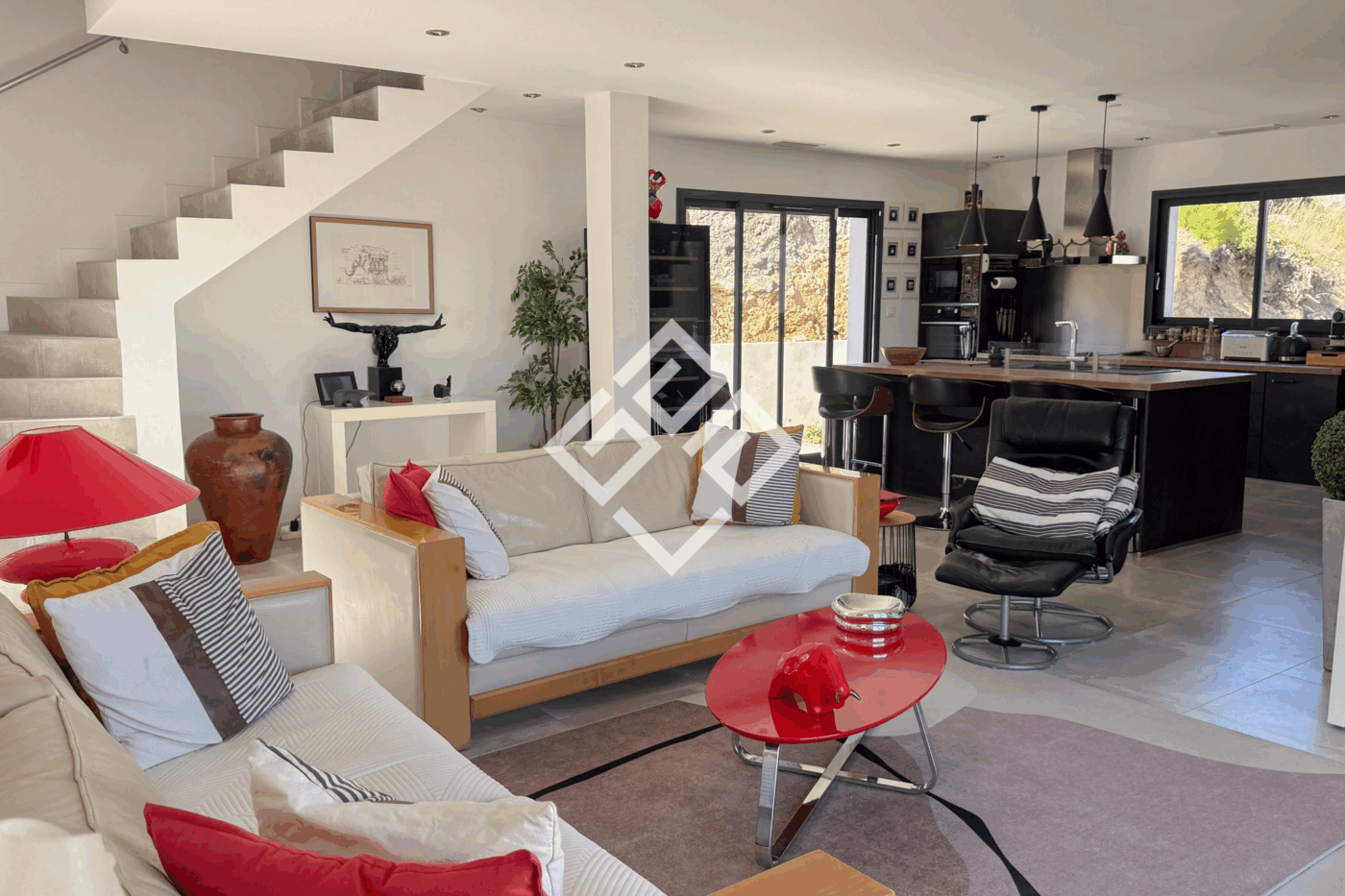 Localisation La maison se niche dans un quartier résidentiel calme. À deux pas des commodités, des écoles et des commerces, elle conserve pourtant un air de retraite, bercée par le calme et la beauté des paysages environnants. Une adresse idéale pour ceux qui veulent conjuguer vie familiale et art de vivre méditerranéen.