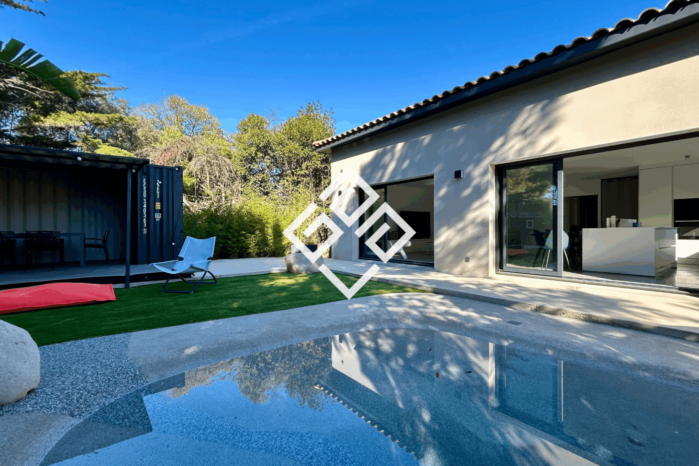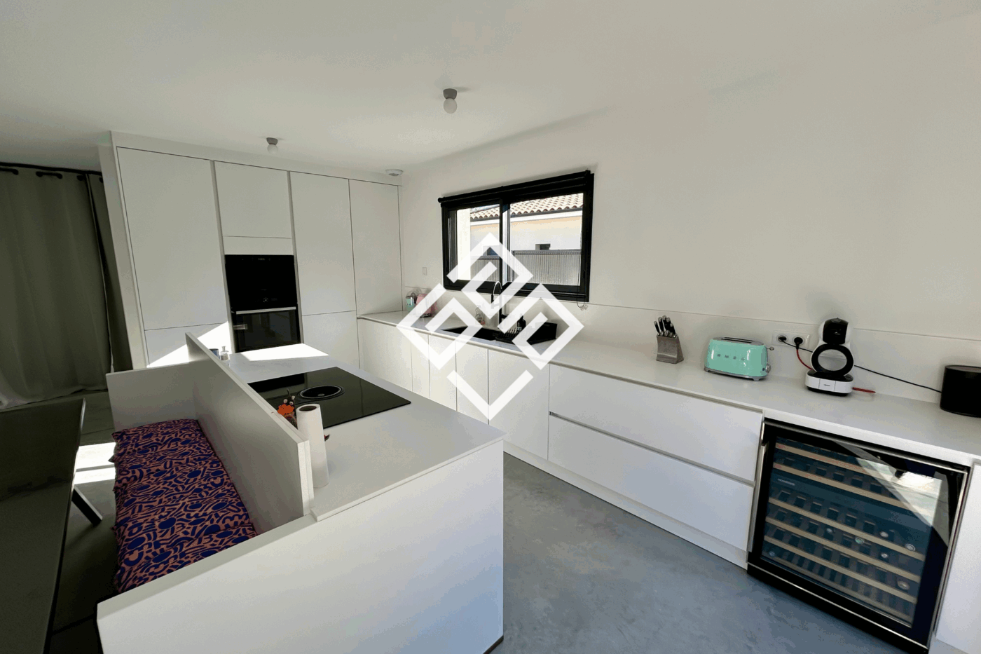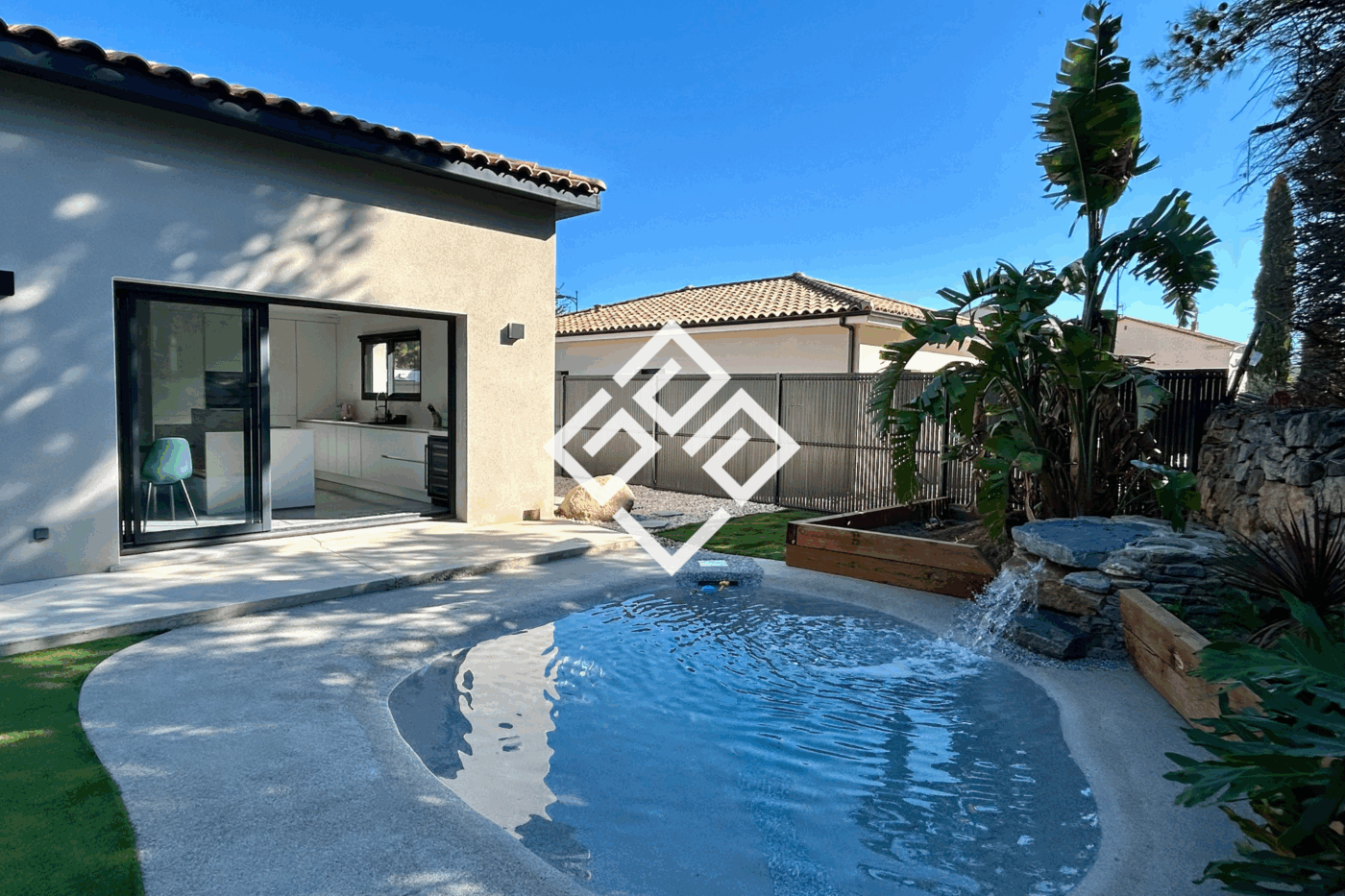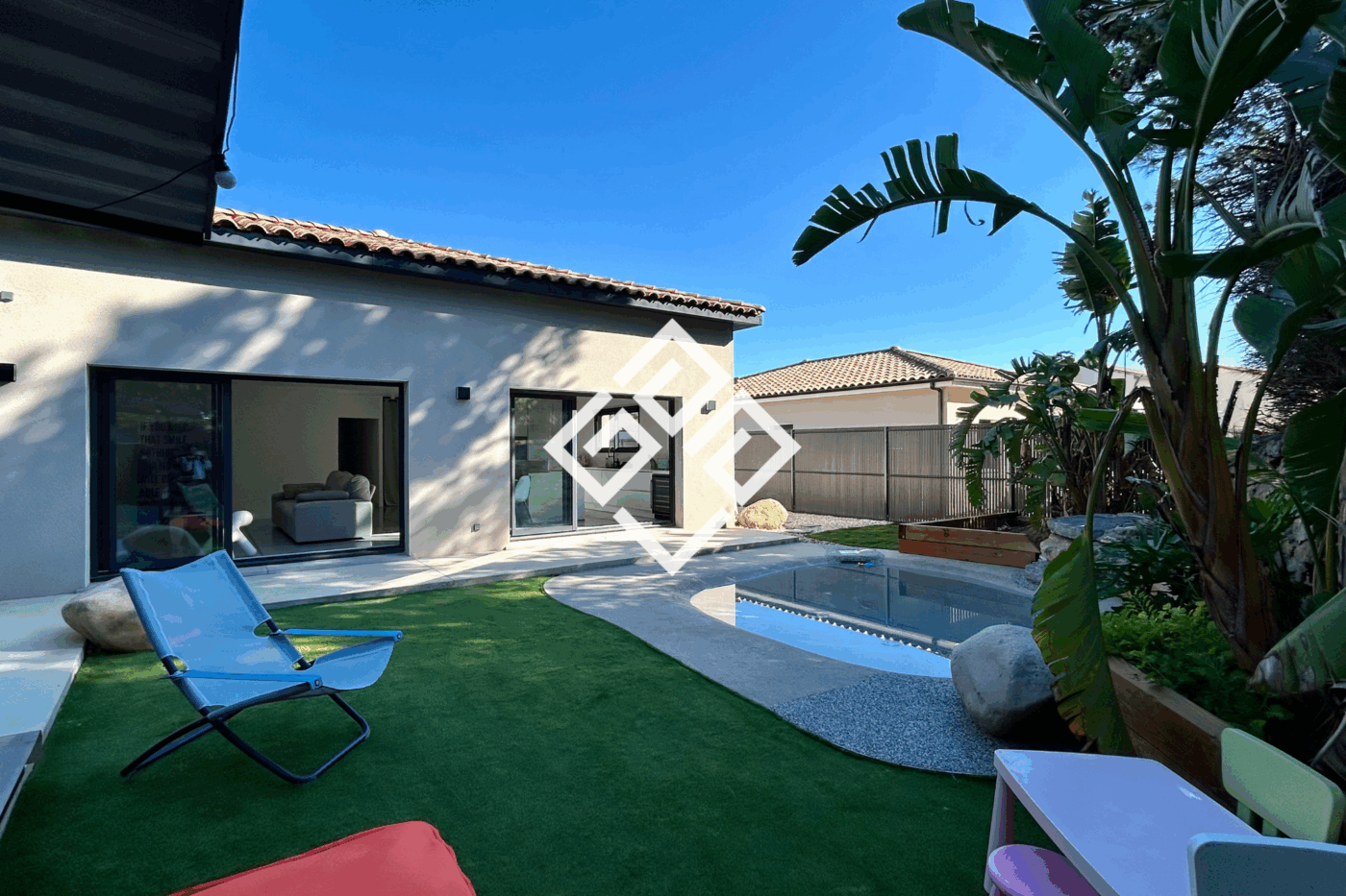 En exclusivité chez GALA IMMOBILIER : découvrez cette magnifique villa contemporaine de plain-pied 115 m2 (construction 2024), nichée au coeur d'un écrin de verdure soigneusement aménagé. Conçue pour allier esthétique moderne, confort et sérénité, elle offre un cadre de vie d'exception. Ses lignes épurées, ses volumes lumineux et ses larges baies vitrées ouvrent naturellement l'espace de vie sur un extérieur pensé comme une véritable oasis privée. La piscine style lagon, son jacuzzi intégré et sa cascade, s'intègrent parfaitement dans un jardin paysager et arboré, transformant cette demeure en un véritable refuge de rêve et de tranquillité Un bien rare où modernité et nature s'harmonisent parfaitement, à seulement 10 minutes de Narbonne. La villa est composée : Entrée avec placards intégrés (5,86 m2), Séjour spacieux et lumineux (38,09 m2) ouvert sur une cuisine moderne entièrement équipée, couloir (4,46 m2) desservant : 2 chambres confortables (11,09 m2 chacune), 1 salle de bain élégante (7,78 m2) avec baignoire, douche à l'italienne, double vasque et WC. Suite parentale (18,59 m2) avec dressing (5,04 m2) et salle d'eau privative (2,77 m2), buanderie fonctionnelle (4,12 m2) Un garage spacieux de 28,39 m2 vient compléter ce bien. La partie extérieure : sur une parcelle de 577 m 2 une piscine lagon avec jacuzzi au sel. Un container (pool house) Ses atouts : prestations haut de gamme, construction 2024 , extérieurs pensés pour la détente et la convivialité, climatisation réversible (gainable), cuisine équipée, alarme. Informations complémentaires : localisation idéale, toutes les commodités à proximité: école, commerces, traiteur, supérette.